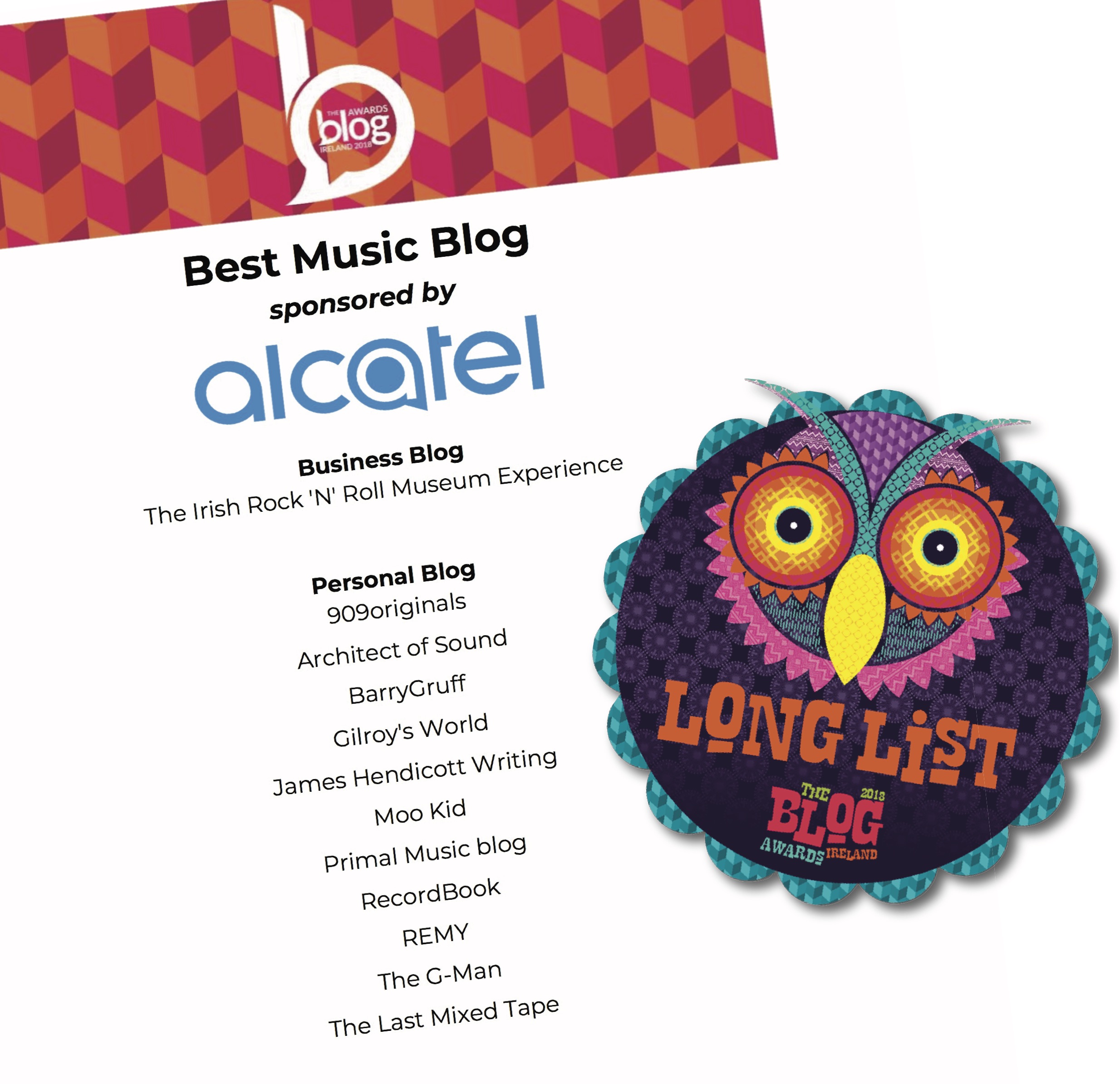909originals is delighted to be on the longlist for an award in the Blog Awards Ireland 2018, in the Music category, sponsored by Alcatel.