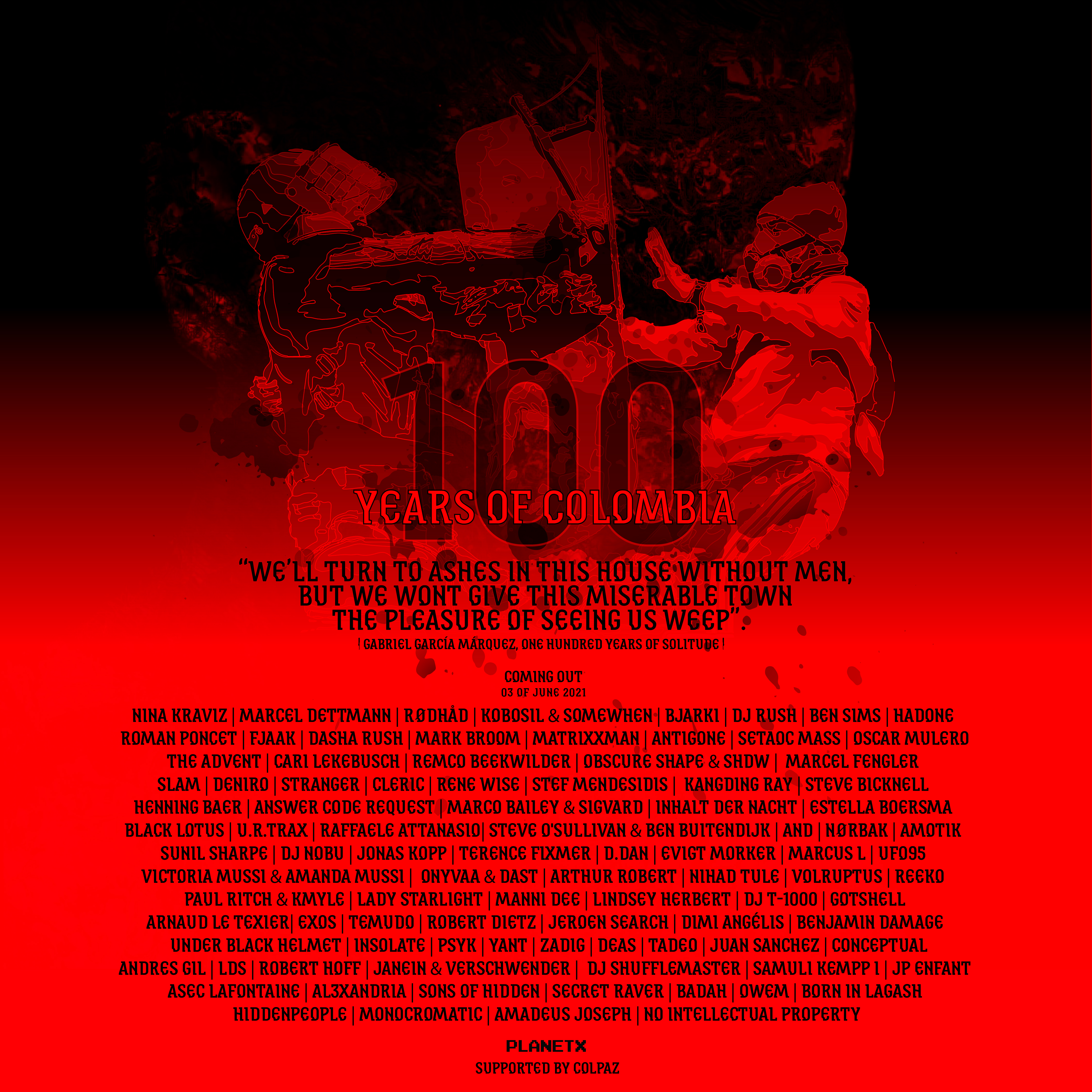According to the official press release, ‘The compilation 100 Years Of Colombia brings the techno scene together to make attention and awareness of what’s happening in Colombia, with a hope for a better future. All the income from the compilation will be donated to charity organisations across Colombia.’