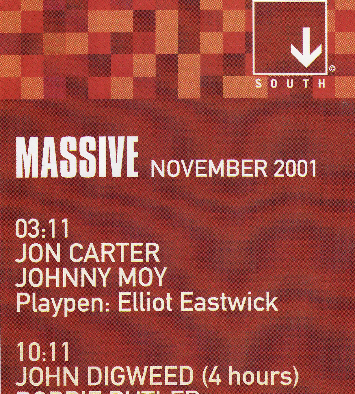 South would undergo a couple of operational changes prior to the doors eventually being closed in mid-2004 – the departure of O’Keeffe and Jackman in late 2002 saw Joe Clarke of Limerick’s Trinity Rooms brought in to operate a night called Karnival, while Northern Ireland’s High On Life, aka Billy Dunseath, and Wexford promoter Rob Murphy ran a number of gigs in the venue’s latter months