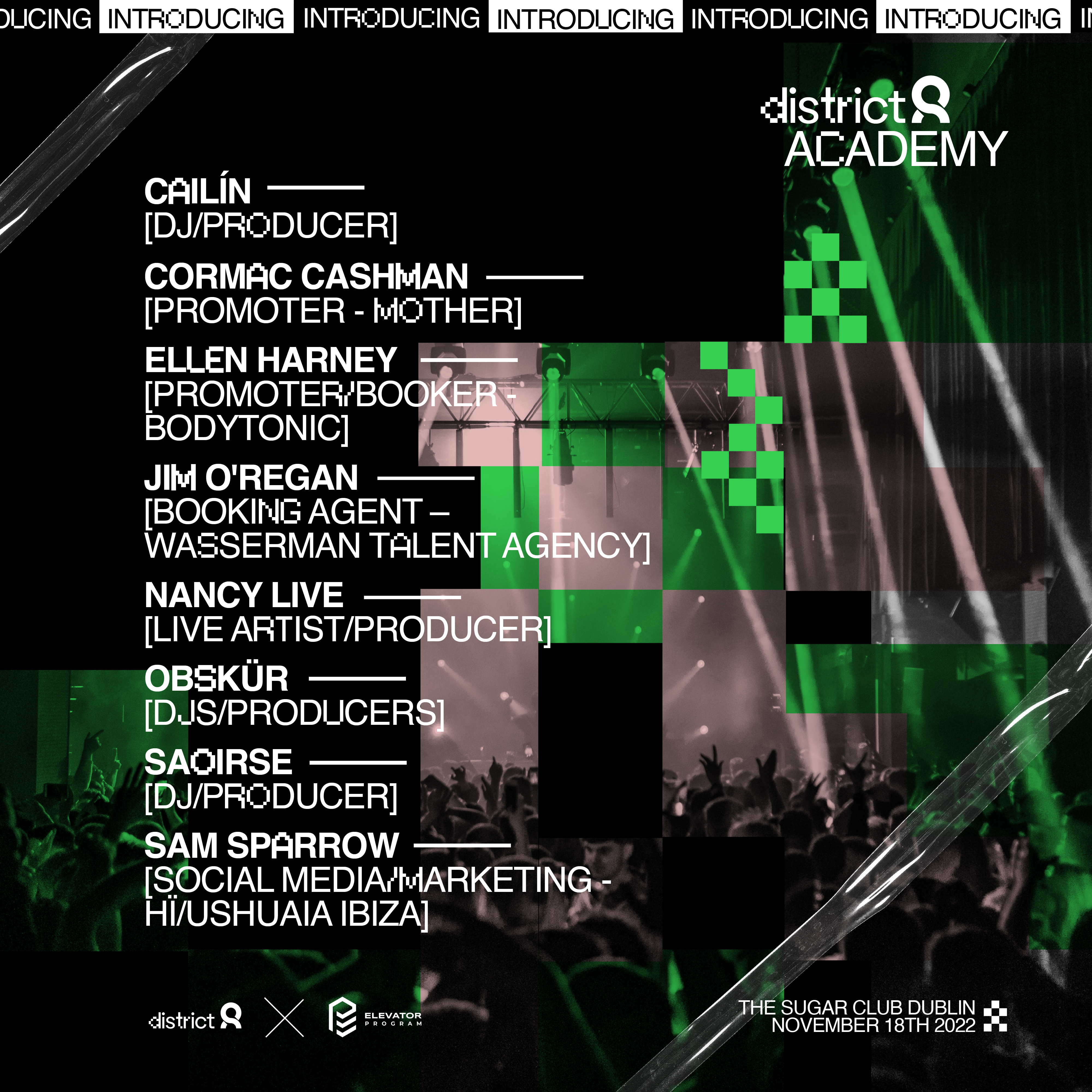 Cailín – Hailing from Waterford, Cailín has earned her reputation as one of Ireland’s leading DJs & producers. A firm fixture on District 8’s biggest line-ups.